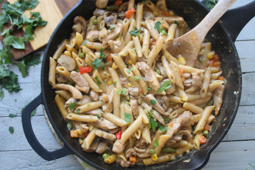 Garnish with parsley and serve. Enjoy your Budget Kitchen Sink Pasta Skillet!